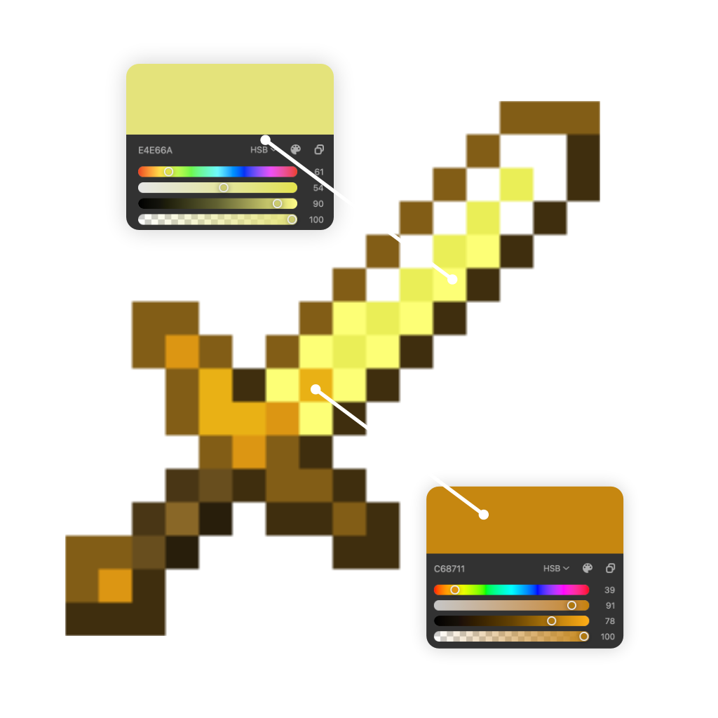橙色的感官亮度会比黄色更低,因此当我们需要一个比黄色看起来更深的颜色的时候,相比直接拉低 V 的值,将色相向橙色偏移往往会更有感觉。 橙色在描述黄金的阴影的时候尤其有效。 -
