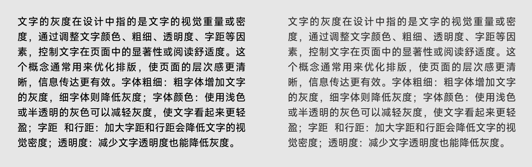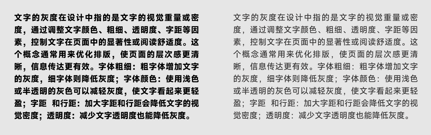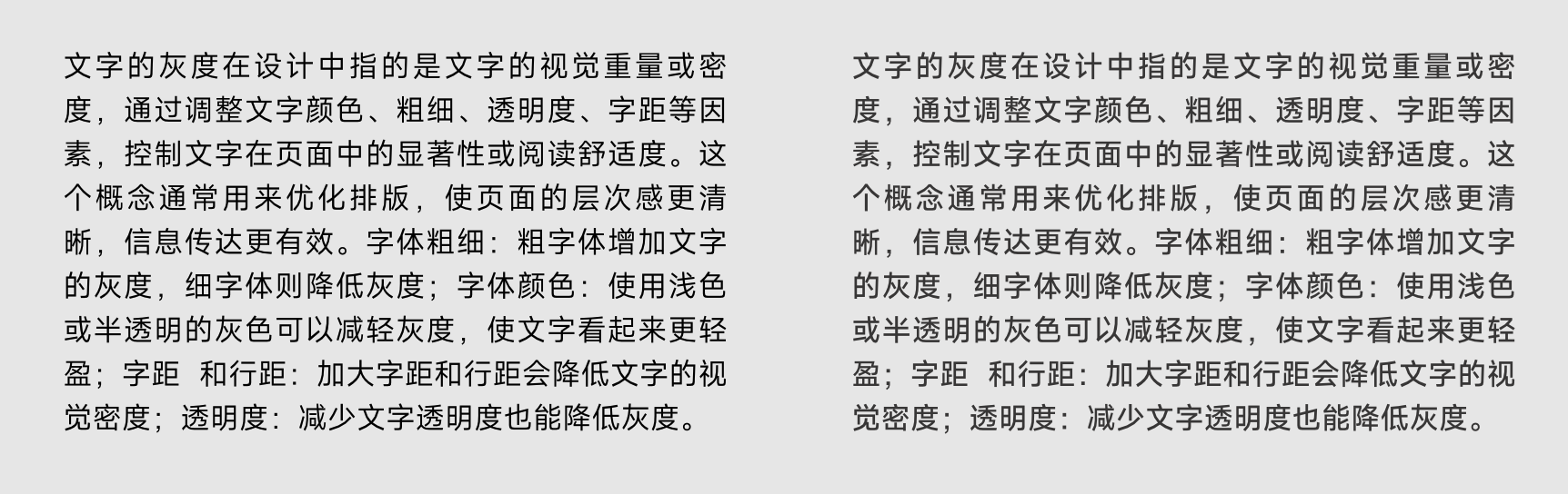 长文本的字重不建议超过 Medium. 一个字体中 Normal 和 Regular 字重一般是为了阅读设计的,是比较好的选项。 -