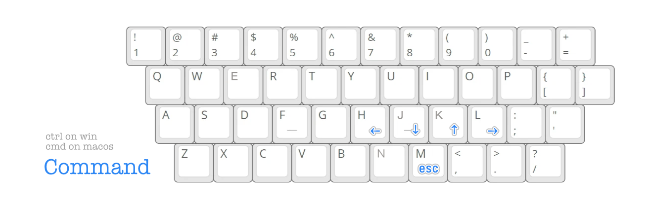 第三行是整个键盘的黄金位置,我在里面放了编程中十分常用的符号: - > 的组合在一些语言中经常见到,因此挨在一起; { [ 较常用,但在大部分时候会被 IDE 补全另一半,所以只将前半部分放在了这一行; , . / 是在终端经常输入。至于为何 ( ) 被放在了第三行,是因为我发现我的右手按 N 和 M 要比 H 要更舒适。而 ( ) 在各类编程语言中出现的频率都很高,因此将 N 和 M 的黄金位置留给了括号。 -