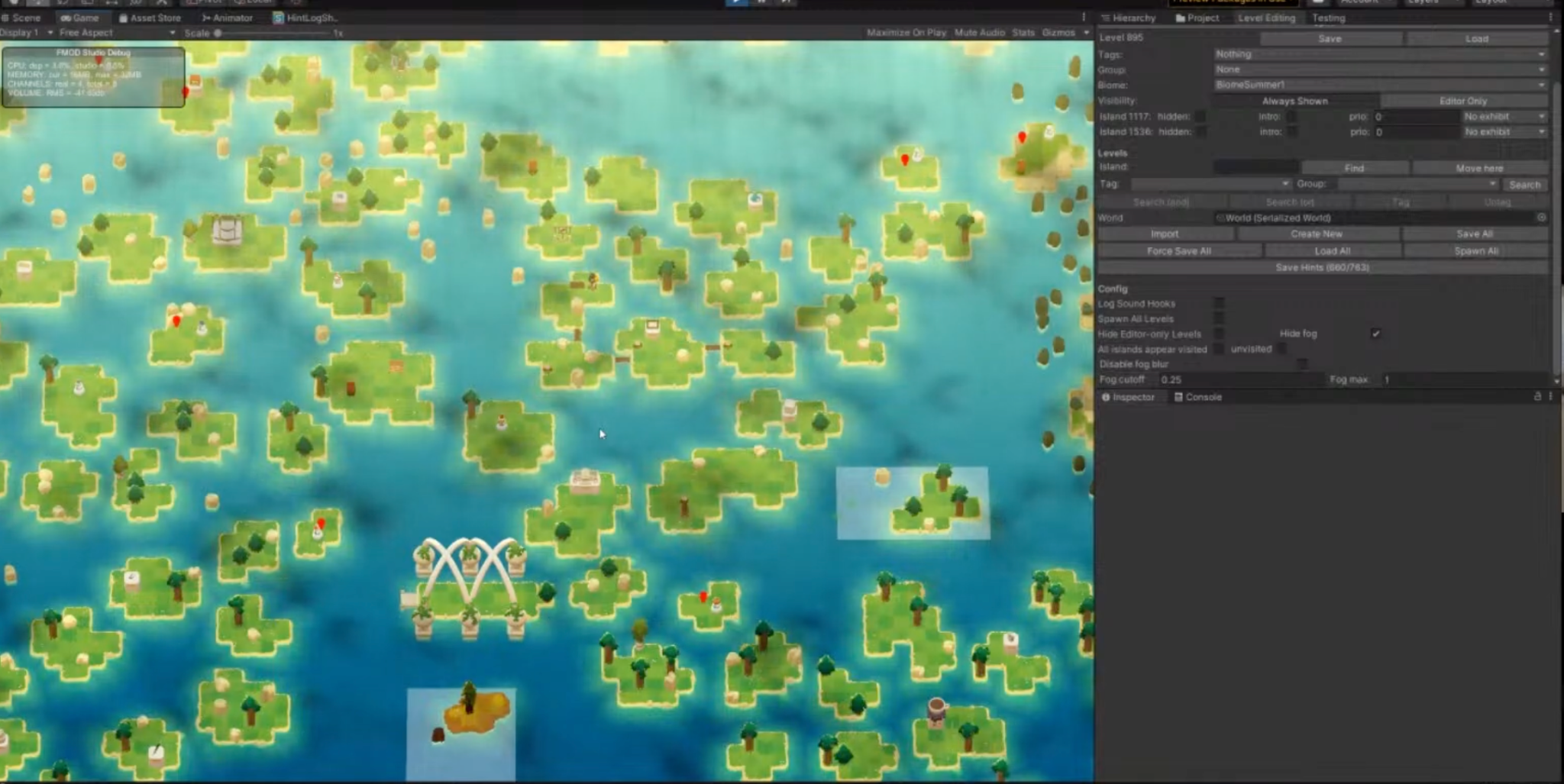 Arrange:可以自由移动和缩放相机,双击关卡即可进入该关卡并切换至 Play 模式;也可以自由地拖拽关卡(岛屿)的位置 -
