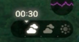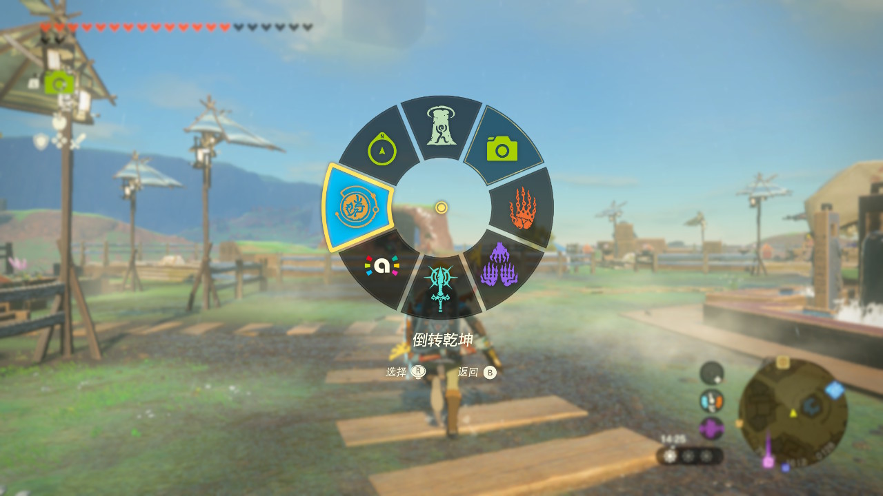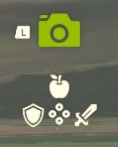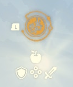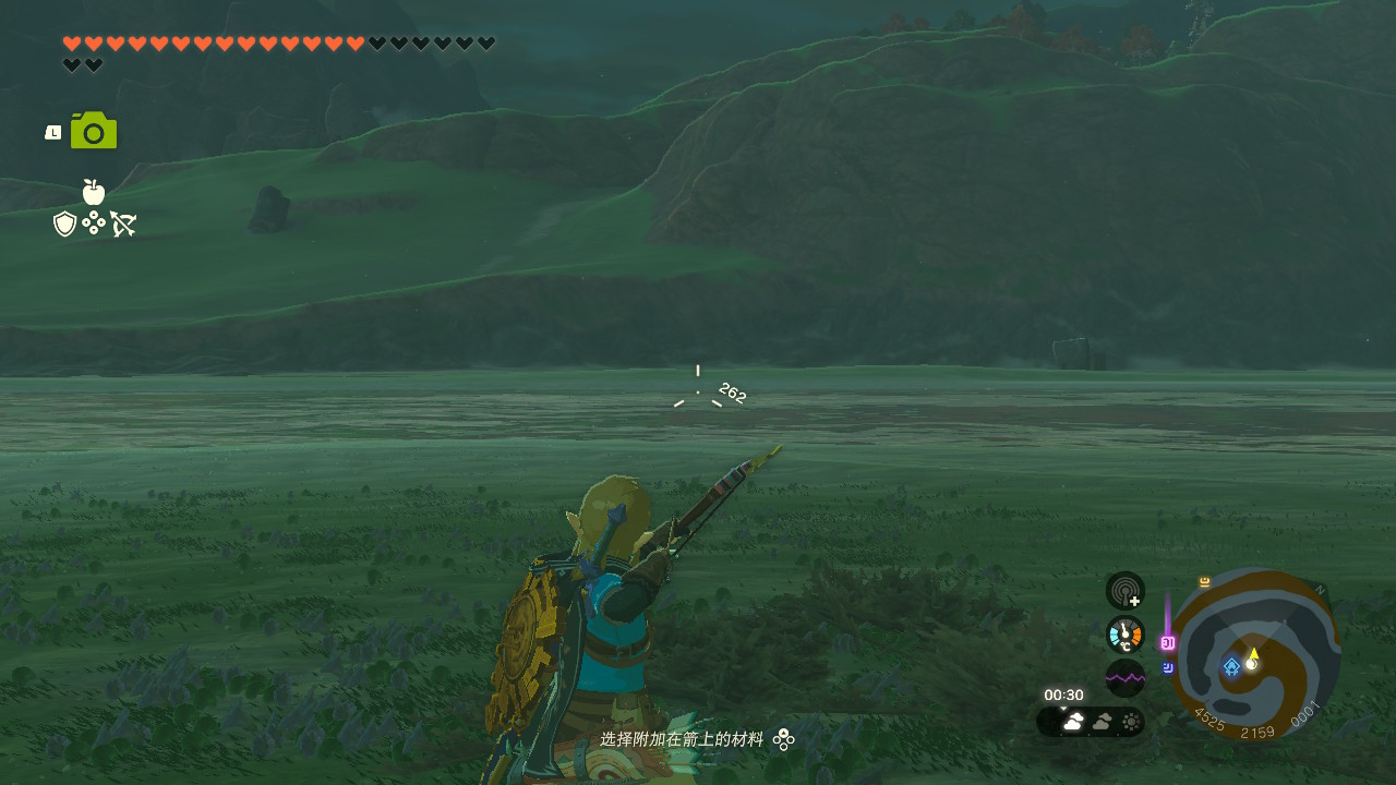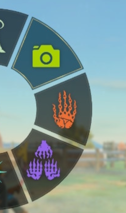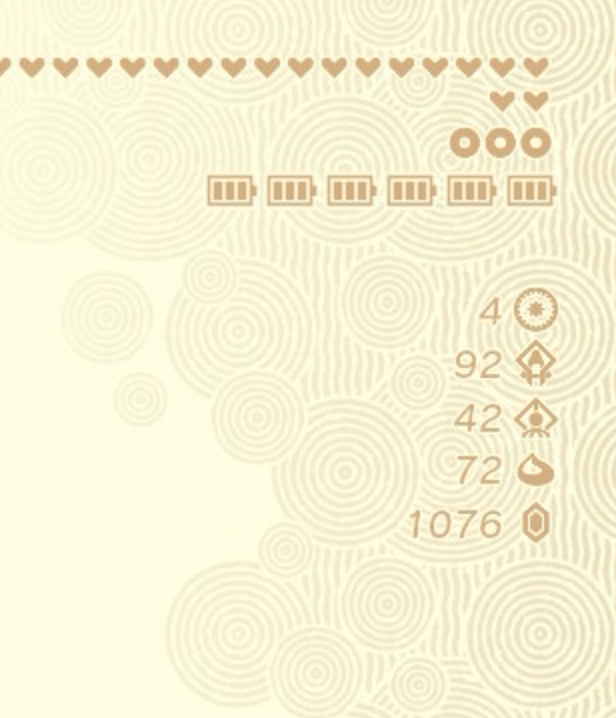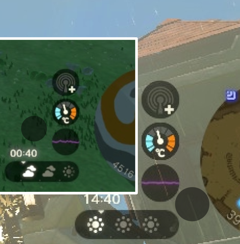王国之泪世界渲染后的画面,亮度控制很严格,绝大部分情况,画面都会比 HUD 的亮色要暗,确保了玩家在大部分时候都可以容易地看清 HUD 另一部分的 HUD 则采用半透明黑底 + 亮色的方式,这是比较常见的设计方式。(右边的多出的黑圆是我用设计软件尝试验证叠加模式的结果,确认是正常的叠加模式) -